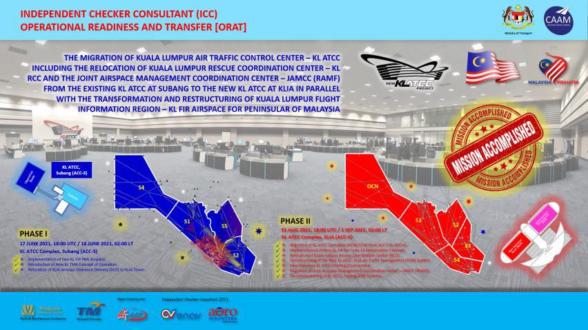 Independent Checker Consultant (ICC) service provided for the Operational Readiness, Activation and Transition (ORAT) of New KL ATCC Project which involves the migration of [1] KL ATCC operation (including the Rescue Coordination Center – RCC and Joint Airspace Management Coordination Center – JAMCC), [2] the restructuring of Kuala Lumpur Flight Information Region (KL FIR) En-route sectorization (from 7 to 14 sectors), [3] the commission of new KL FIR's Communication, Navigation, Surveillance / Air Traffic Management (CNS/ATM) System, [4] the relocation of KLIA’s Airways Clearance Delivery (ACD) Controller Work Position (CWP) to KLIA Air Traffic Control Tower and [5] the introduction of Triple Independent Simultaneous Departures/ Arrival Operations at KLIA (3 runway capacity of 108 movement per hour) by ENAV AP